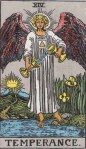Temperance is associated through its cross sum (the sum of the digits) with The Hierophant. The Hierophant (ideally) brings the lessons of the other world into this one in an understandable form; Temperance (among other things) judges how well we have mastered the wisdom of the other worlds.
