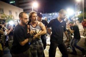 TEL AVIV, ISRAEL – AUGUST 06: (ISRAEL OUT) Israeli police arrest a demonstrator as thousands of people march in the streets during a protest against the rising cost of living on August 6, 2011 in Tel Aviv, Israel. Protests across Israel were spurred following a Knesset vote to approve the national housing committees law, which places the authority for approving building projects in the hands of regional committees. (Photo by Uriel Sinai/Getty Images)