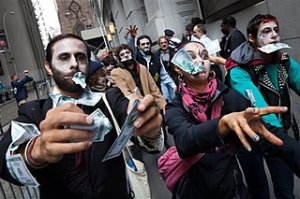 Protesters from Occupy Wall Street march through New York’s financial district dressed as “corporate zombies” Monday, Oct. 3, 2011. The protests have gathered momentum and gained participants in recent days as news of mass arrests and a coordinated media campaign by the protestors have given rise to similar demonstrations around the country. (AP Photo/John Minchillo)