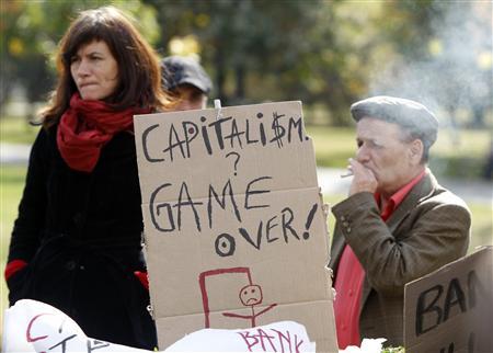 Protesters take part in the “Occupy Bucharest” protest in downtown Bucharest October 15, 2011. REUTERS/Bogdan Cristel