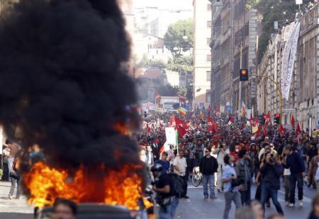 A car burns during a demonstration of the ‘Indignant’ group against banking and finance in Rome October 15, 2011. REUTERS/Max Rossi