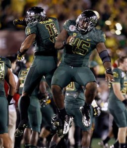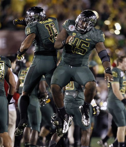 Oregon’s Eddie Pleasant, left, and Terrell Turner, right celebrate after Oregon recovered a Wisconsin fumble during the second half of the Rose Bowl NCAA college football game Monday, Jan. 2, 2012, in Pasadena, Calif. Oregon won 45-38. (AP Photo/Matt Sayles)