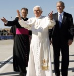 Archbishop Timothy Broglio of the U.S. military, Pope Benedict XVI, and then-President George W. Bush during the Popes 2008 visit to the United States.