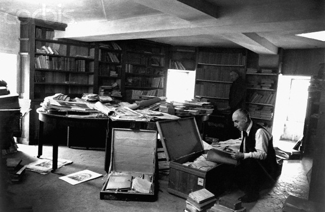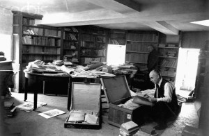 ca. 1972, France — Writer Count Rene de Chambrun searches a study in Chateau Lagrange for letters of 18th century French military leader Marie Marquis de Lafayette, one-time owner of the house. | Location: Saint-Julien, France. — Image by © CORBIS