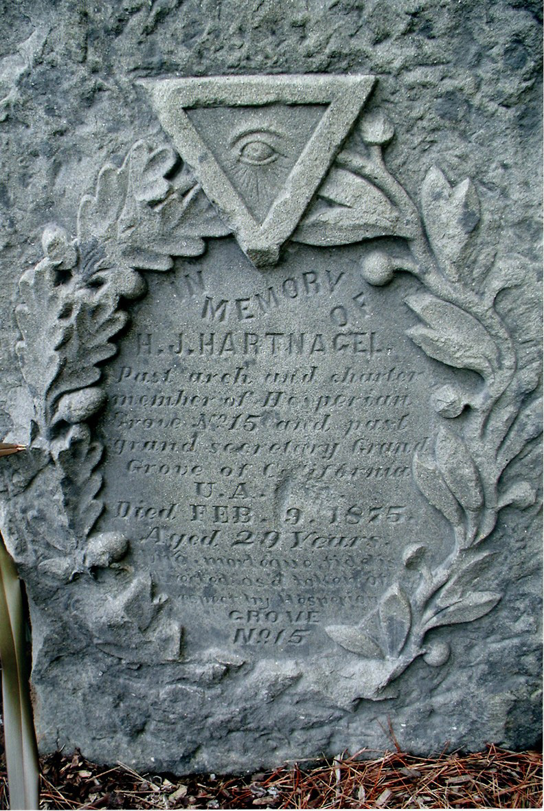 Herman Joseph Hartnagel, born in Damstadt , Germany and a naturalized United States citizen, was an officer of the United Ancient Order of Druids (UAOD), Hesperian Grove No. 15 of San Francisco . Records show he registered to vote at age 21 in 1867 and was never married. He died in Belmont , California of consumption (tuberculosis) on February 9, 1875. Originally interred in Odd Fellows Cemetery in San Francisco , he now lies in the Odd Fellows section of Greenlawn Memorial Park (where 26,000 bodies unclaimed by families from San Francisco ‘s Odd Fellows Cemetery are buried in a mass grave). According to records at Greenlawn, Hartnagel’s physician was Dr. Robert Mackintosh and the undertaker was Massey and Yung.