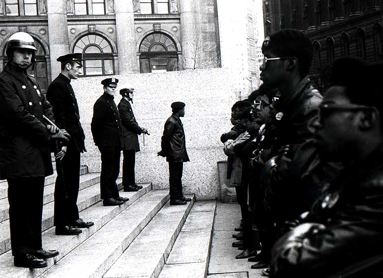 He is flanked by two black-clad security guards sent by the investor that is trying to clear the building.