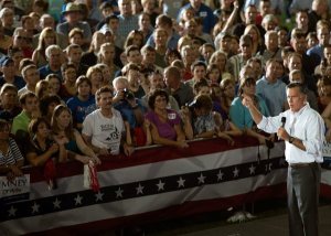 epa03389164 Republican party candidate for United States President, Mitt Romney (R), addresses a crowd of supporters during a rally in Nashua, New Hampshire, USA, 07 September 2012. Romney will face United States President Barack Obama in the national election on 06 November 2012. EPA/CJ GUNTHER