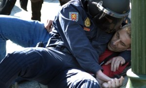 A riot policeman arrests a protester during a general strike on November 14, 2012 in Madrid. General strikes in Spain and Portugal will spearhead the day of action called by European unions and joined by activists as anger over governments’ tight-fisted policies boils over. AFP PHOTO / LLUIS GENELLUIS GENE/AFP/Getty Images