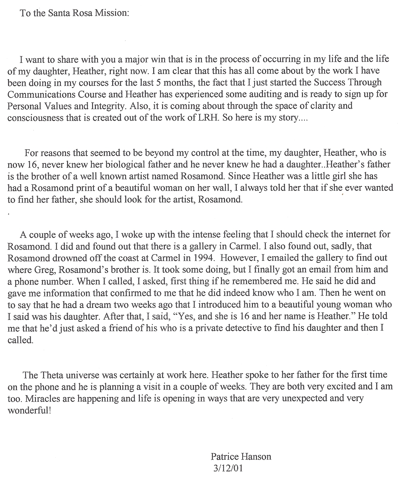 In a letter Patrice sent to the head of the Scientology Mission of Santa Rosa, she gives credit to the workings of the “Theta Universe” I am but a pawn in this Science Fiction game. At sixteen my impressionable daughter thinks her career is taking off, she on her way to Stardom after she appears in Tom Snyder’s biography that I oppose. This caused my daughter to judge her father, see if he has the right stuff, verses her teachers at the Mission who is Auditing her to reveal she indeed has the right stuff, she after all is the niece of the world famous artist known as Rosamond.