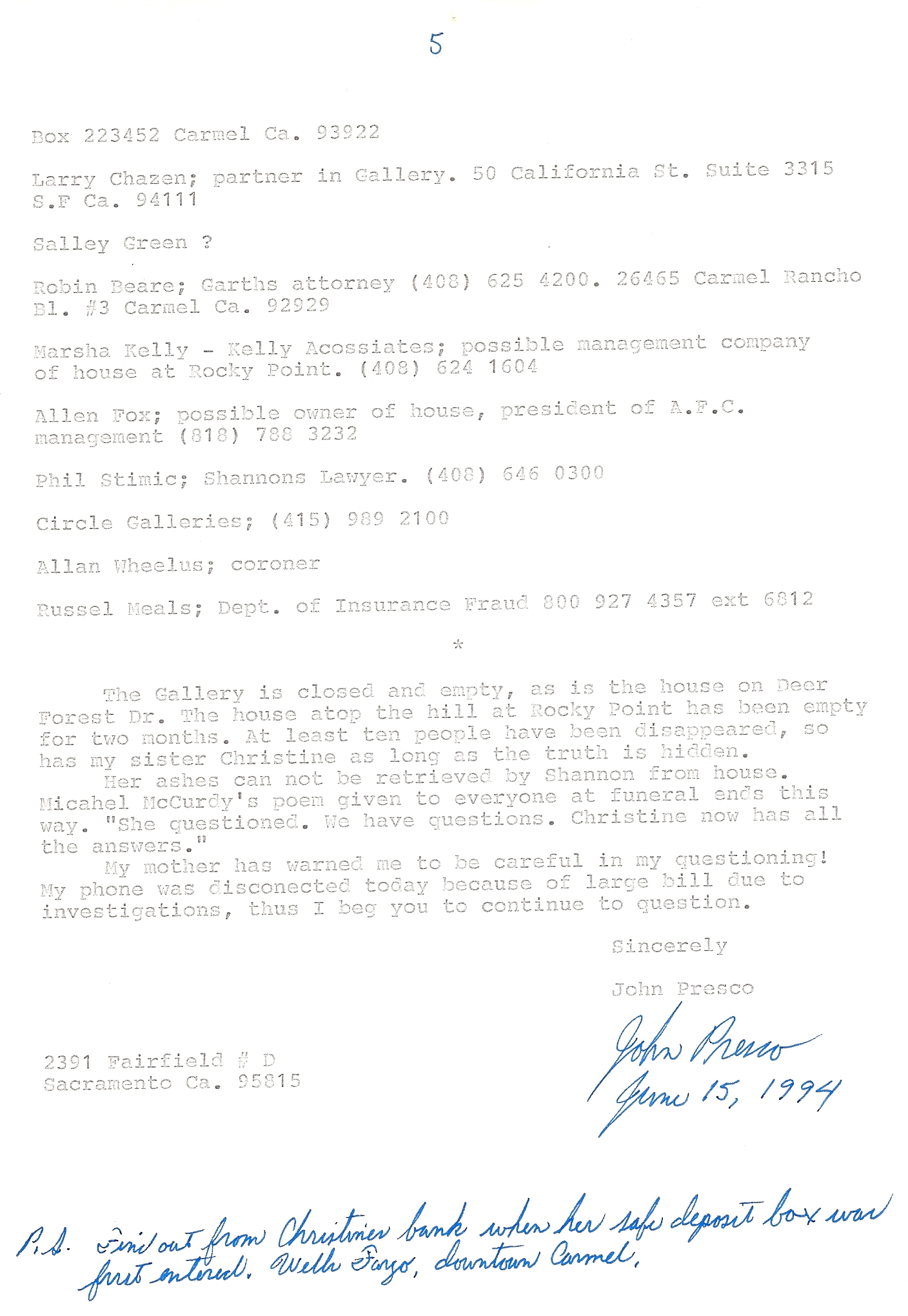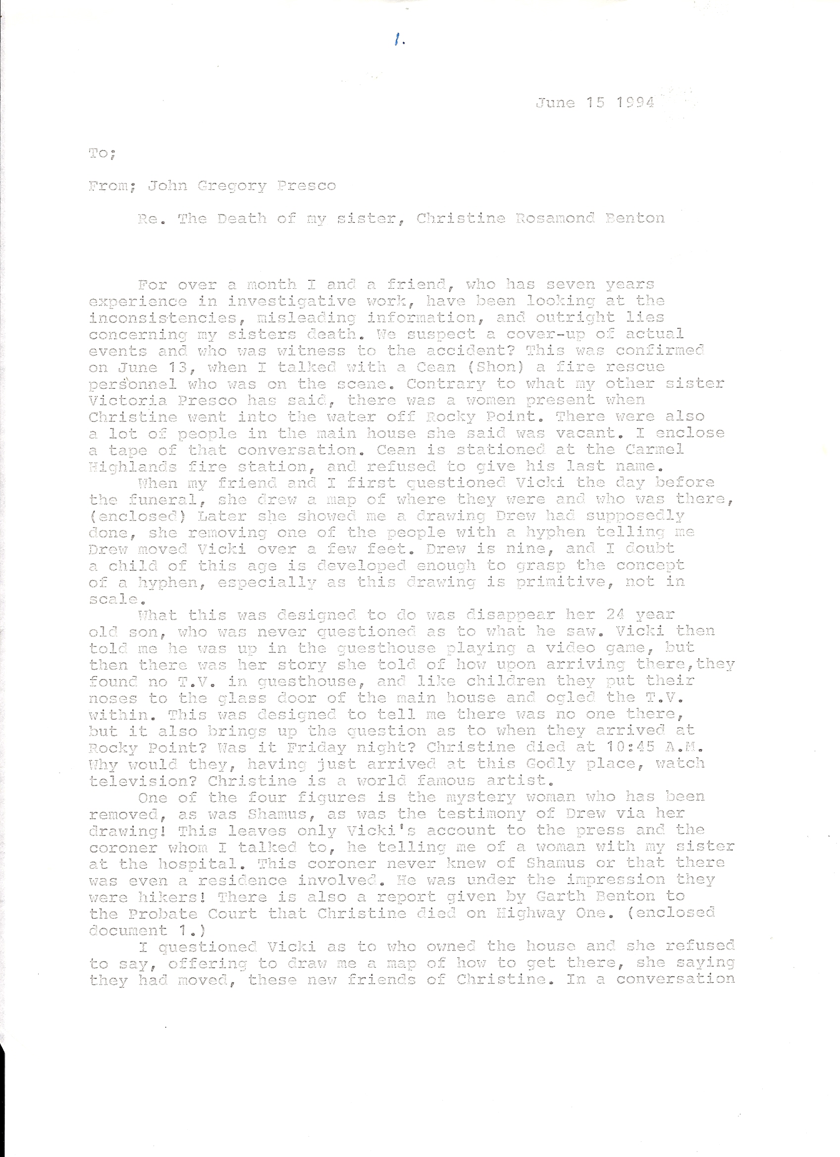 Here is my report I sent to the Sherif and the Coroner on June 14, 1994. It contains many questions, most of which have gone unanswered. I was getting along fine with my sister, Vicki, until I asked for the names and a way of contacting the people who lived in the house at Rocky Point. Vicki said they had moved and it didn’t matter if I knew who they were. This is astounding, as there are two biographies and two screenplays out there. If you were watching the movie about Rosamond, you would expect to see the guest who invited her to Rocky Point. Was that person there when Christine ended up in the water? Does this person want to remain unknown lest the adult Heir file a wrongful death suit? That was my first consideration for why the facts did not add up. I was told by a neighbor that the owner was in an awful hurry to sell that house, and did so at a substantial loss, suggesting he took the first offer so he/she could disappear. Did Vicki tell this person I wanted to talk to him and thus he avoided me? If so, this is concealing information.