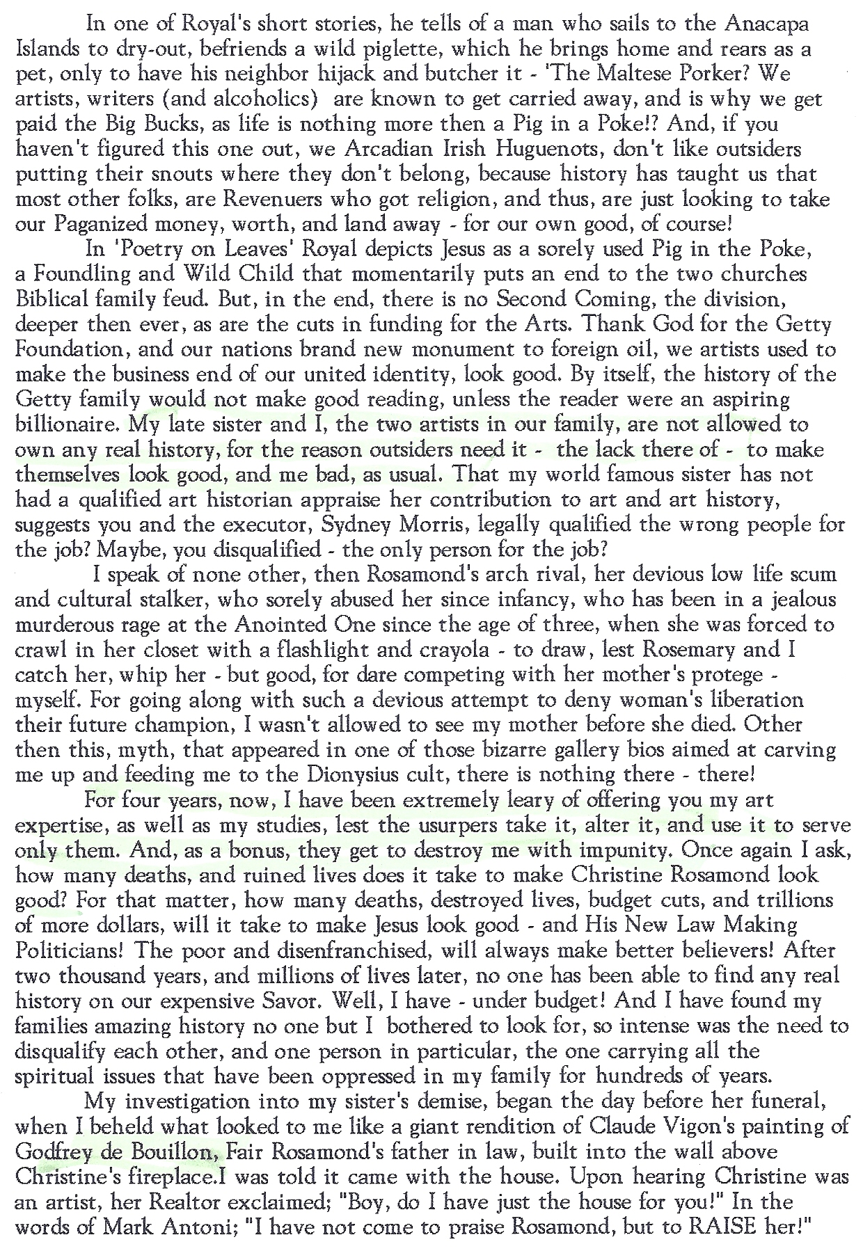 Above is a letter I sent Judge Richard M. Silver who presided over the divorce of the world-famous artist, Christine Rosamond Benton, and her probate. I point out an exact copy of this painting hung in the Benton home. I am a bit cryptic in this letter because I fear the parasites lurking in the wing would take what they want from my efforts, use it in their book – and their movie! Consider how many words they contributed, and how many I have produced before March 5, 1998 – four years before Dan Brown employed a world-famous artist to drop clues there exist a “rose line” that represents a lineage from Mary Magdalene.