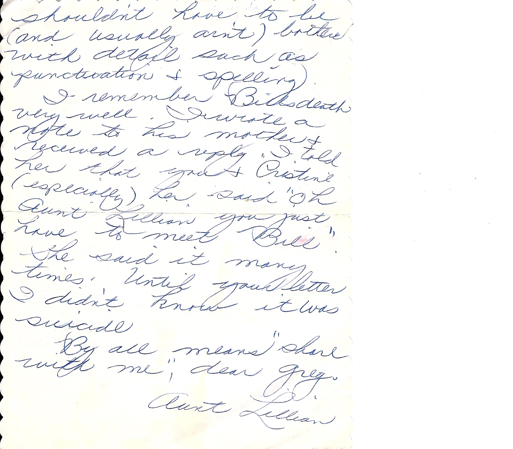 I remember Bill’s death very well. I wrote a note to his mother and received a reply. I told her that you and Christine (especially) her said;