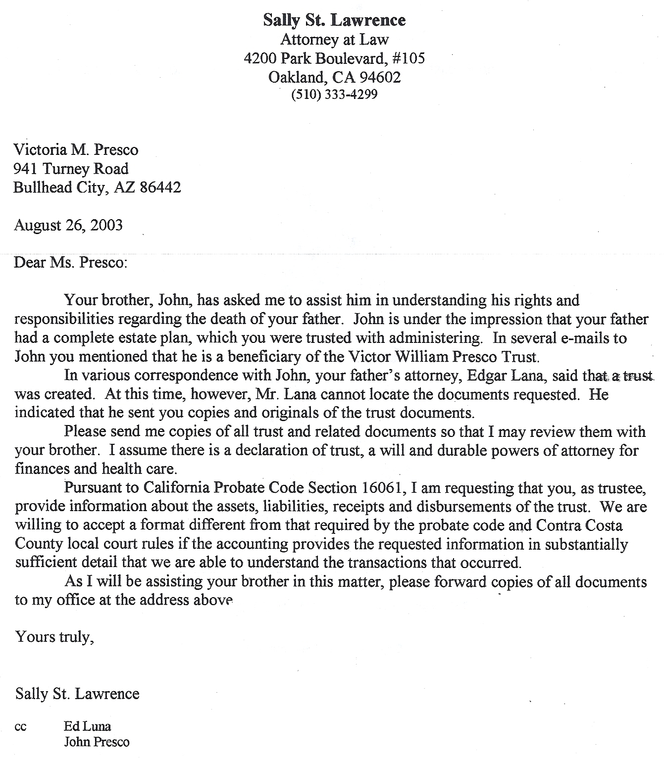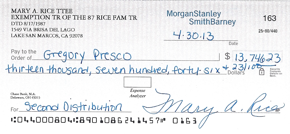 Above is a letter an attorney sent my evil sister, Vicki Presco, who formed a secret bond with my daughter and turned her against me after we found each other. Vicki was Vic Presco’s Trustee and refused to give me the Rosamond prints my father left me. Heather ended up with them. Stacey Pierrot lied to me about selling some of these prints at the Rosamond Gallery in order to get me to contribute to her biography of Rosamond. Vic and Mark stole this artistic legacy from Christine’s heirs. I demand Vicki donate Mark’s share of the Rice Trust – that he gave to her – to my Nazarite Church.