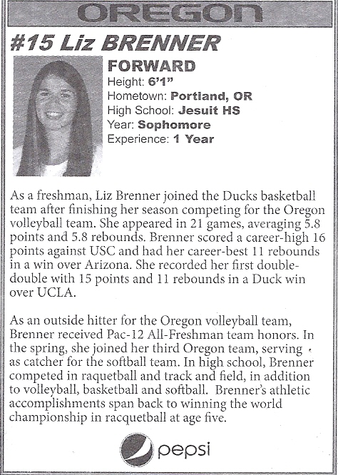 The sophomore from Portland has competed in four varsity sports for the Ducks: volleyball, basketball, softball and track & field. In the classroom, the psychology major owns a 3.07 grade point average, and is pursuing a minor in business administration.