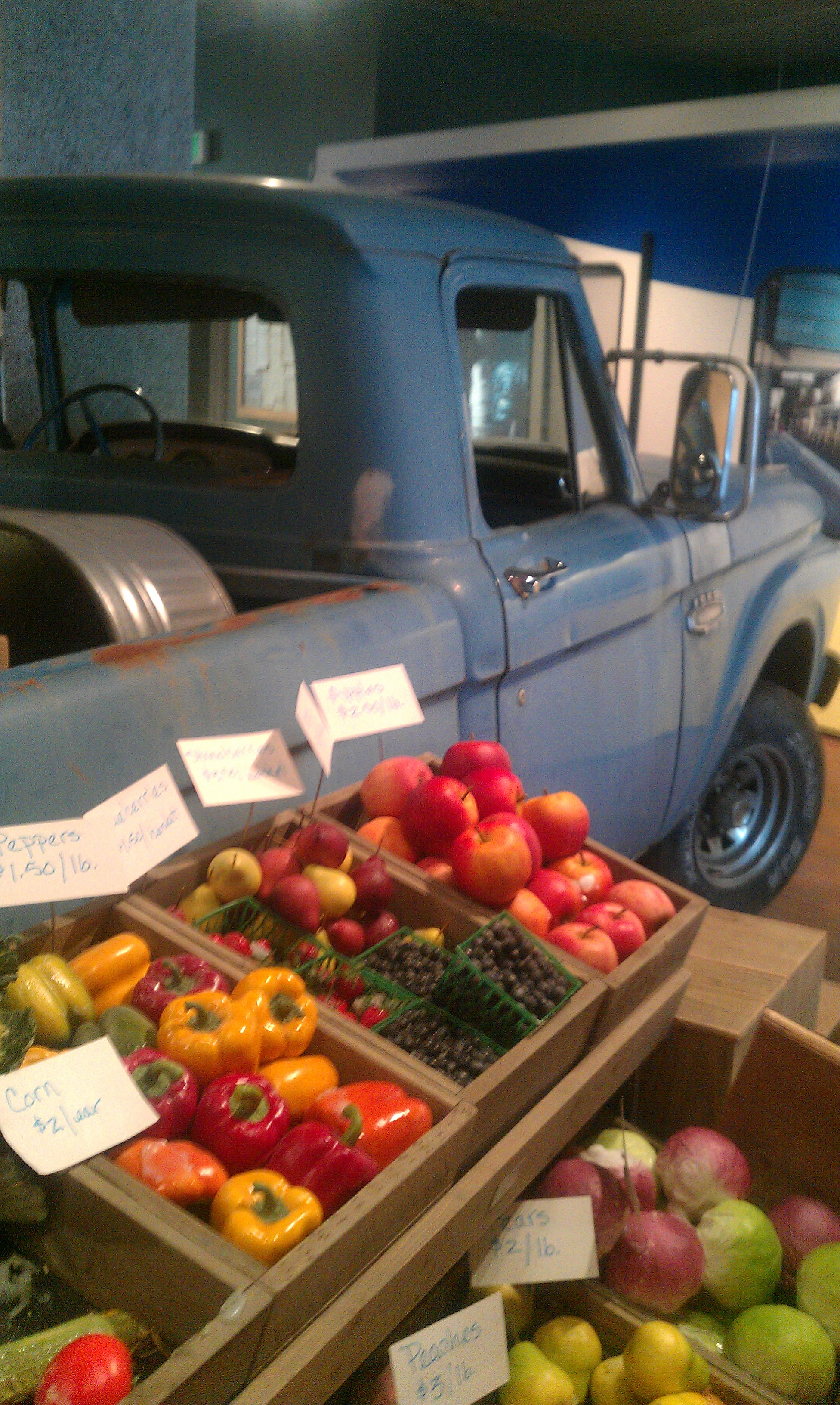 When I entered the Oregon Historic Society, I was stopped in my tracks when I beheld a baby-blue Ford pickup truck surrounded by crates of synthetic fruits and vegetables. My father owned a 1950 Ford flatbed truck and delivered vegetables with it from his Victorian warehouse in Jack London Square. I own a 1972 baby-blue Ford pickup that for two years I have titled the quintessential Oregon old guys truck.