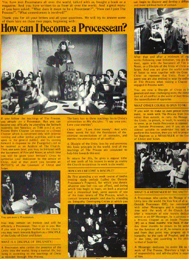 In 1968, the House of Commons enacted policy to restrict the growth of Scientology. The Process was hit by this when American recruits weren’t allowed into England, immigration officials figuring that one cult is as bad as another. DeGrimston sent his flock to the continent. This began the Mark 10 trip, its name taken from the Gospel. Processeans were to abandon their churches and roam from city to city, embracing whatever the gods sent. Hood in hand, DeGrimstons’ Satanic warriors threw themselves on the mercy of a public who were already being tapped for donations by a collection of other cults. (It brought in some income and got rid of church rents.) After Manson, soliciting Processeans were asked: “Are you devil worshippers?” Public interest dropped. Satan was hot stuff in ‘68, when Rosemary’s Baby was a box office hit. Post-Manson it smelled bad.
