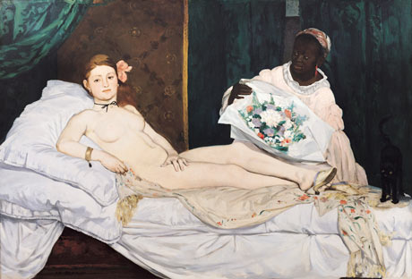When Manet painted his Olympia, he took on the whole tradition of romanticising prostitution. His model is a young woman of the people. Her legs are short; her knee is knobbly; her skin is sallow; the sole of her slipper is worn. The skin of her face is coarser than that of her body, a disjunction marked by the black ribbon that circles her neck. When Waldemar Januszczak, “Britain’s most distinguished art critic”, talks of Manet’s Olympia he identifies the viewer of the picture as a prospective client. Not all men would see the picture that way, and very few women. (Gauguin, Cézanne and Picasso all made versions of the subject which included the client within the composition.) The face Manet’s model turns to the viewer is utterly blank, her eyes unfocused. Her lips are set, even slightly pursed. She is entirely uninterested in the flowers her servant is trying to show her.