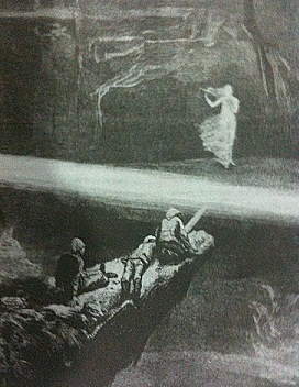 Illustration in the Graphic (1887). Journey to the Spirit of Life; Ayesha, having crossed the ravine, beckons Holly, Leo, and Job to follow her using the wooden plank. A shaft of light divides the darkness about them. She contains various fantasy, adventure, and gothic genre conventions.