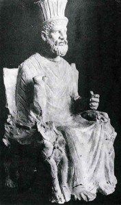 Hadad (Ugaritic ?�ミホト? Haddu) is a Northwest Semitic storm and rain god, cognate in name and origin with the earlier attested East Semitic Akkadian (Assyrian-Babylonian) god Adad. Hadad was also called “Pidar”, “Rapiu”, “Baal-Zephon”,[1] or often simply Baʿal (Lord), but this title was also used for other gods. The bull was the symbolic animal of Hadad. He appeared bearded,[2][3] often holding a club and thunderbolt while wearing a bull-horned headdress.[4][5] Hadad was equated with the Anatolian storm-god Teshub; the Egyptian god Set; the Greek god Zeus; and the Roman god Jupiter, as Jupiter Dolichenus.