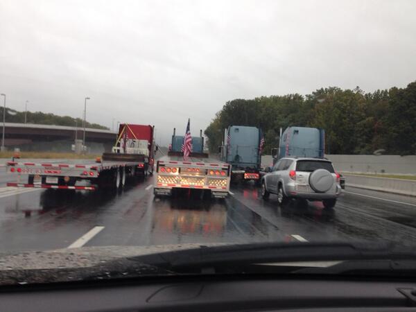 There were police reports of about 30 tractor trailers with American flags and signs for their protest — “Truckers Ride for the Constitution” — driving at the same speed as the rest of traffic on the Beltway in Friday morning’s rush hour. But by mid-day the truckers appeared to have broken into smaller groups amid already-heavy volumes of traffic and rain showers on a holiday weekend.