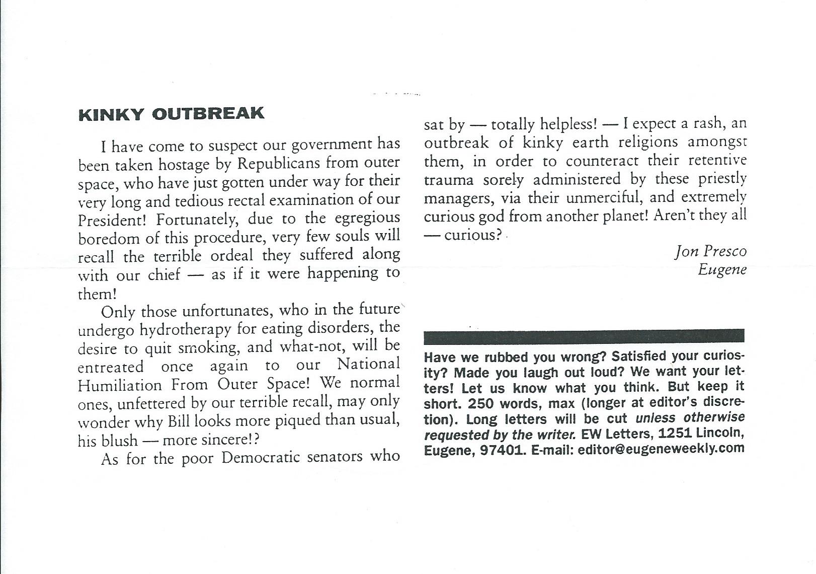 My letter to the Weekly is referring to the Ken Starr and the Christian-right who are conducting a witch hunt against the President of the United States who has sinned. But Bill will not receive one prayer of redemption from Republicans who forgive one of their own of many sins. The word I wanted was “hydrotherapy” as in dunking a witch.