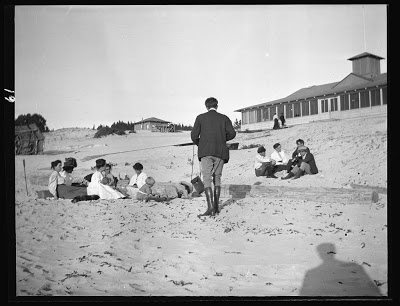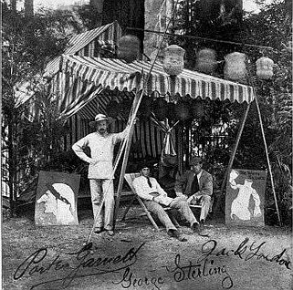 Here, Arnold is photographing George Sterling, Mary Austin, Jack London and Jimmie Hooper on the beach at Carmel. The date is sometime after 1896.