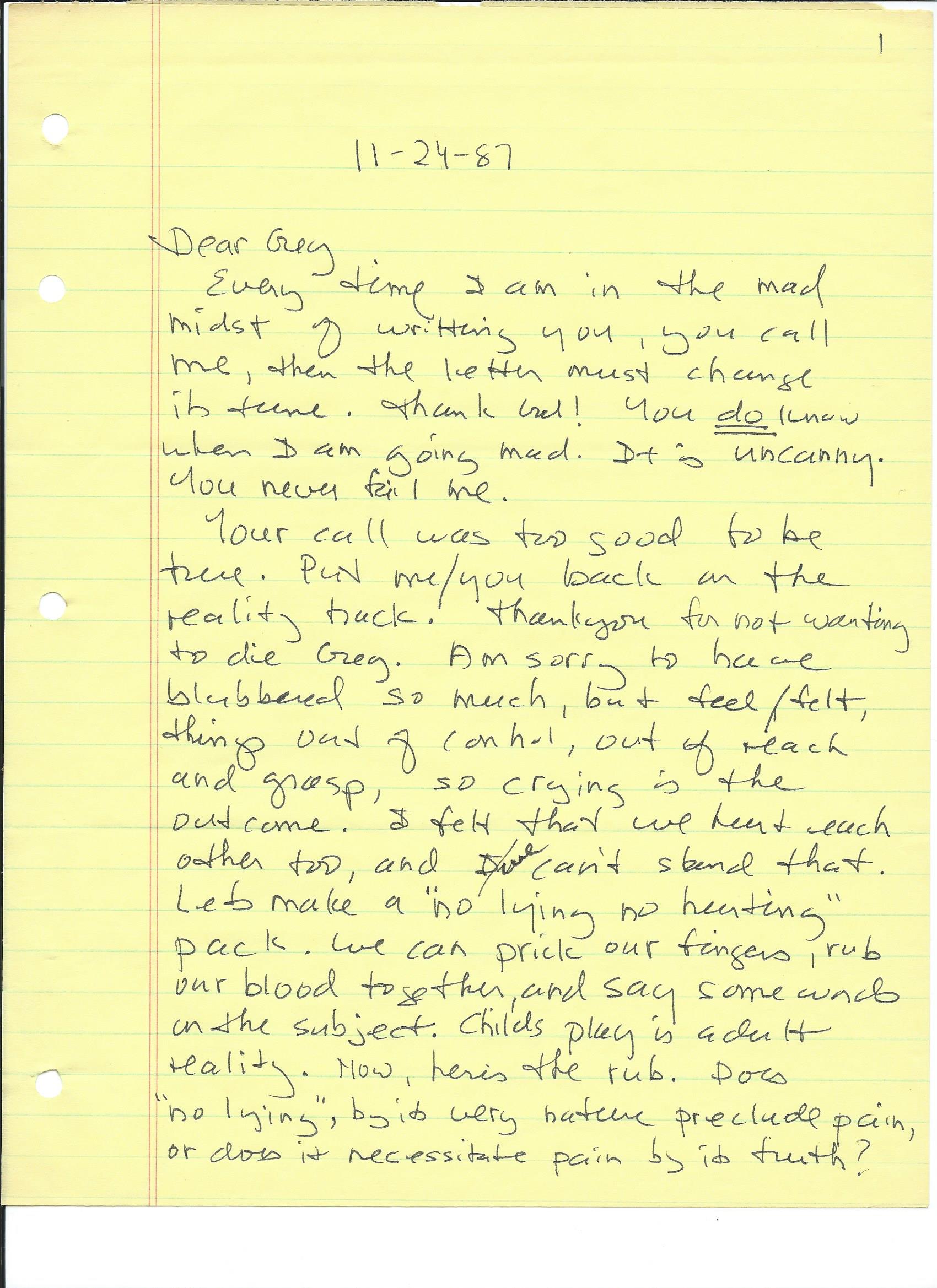 Above is a letter Victoria Arnold sent me. When we found each other after twenty-one years, she bid me to come to Los Angeles and look at something with her. That something turned out to be a black box belonging to her father who was stricken with alztymers. Bill’s sister had become ward of her father’s estate. Inside this box were papers concerning Bill’s death. There were pamphlets on suicide, and how parents of a teenager who committed suicide, could cope. Victoria demanded I tell her what these pamphlets meant. She was fifteen when her dear brother died. I remember how this beautiful young girl looked at me when I left her home in San Mateo. Her eyes asked;