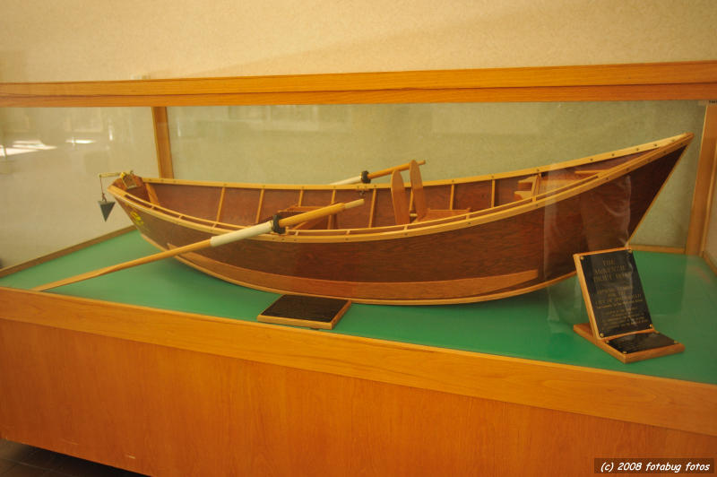 McKenzie dories are specialized to run rapids on rivers, and first appeared on the McKenzie River in Oregon in the mid-20th century. They have a wide flat bottom for low draft, a narrow bow that is flat, often mistaken for the transom, which instead is pointed. The reason for this is that the rower faces downstream, therefore the part of the boat which first hits the waves (approaching from behind) must be pointed or very narrow to throw the water to the side. The bow is then widened so that a small outboard motor and/or anchor bracket can be attached. Those unfamiliar with the craft would say that they are rowed backwards. McKenzie dories without a transom are called “double-enders”.[2]