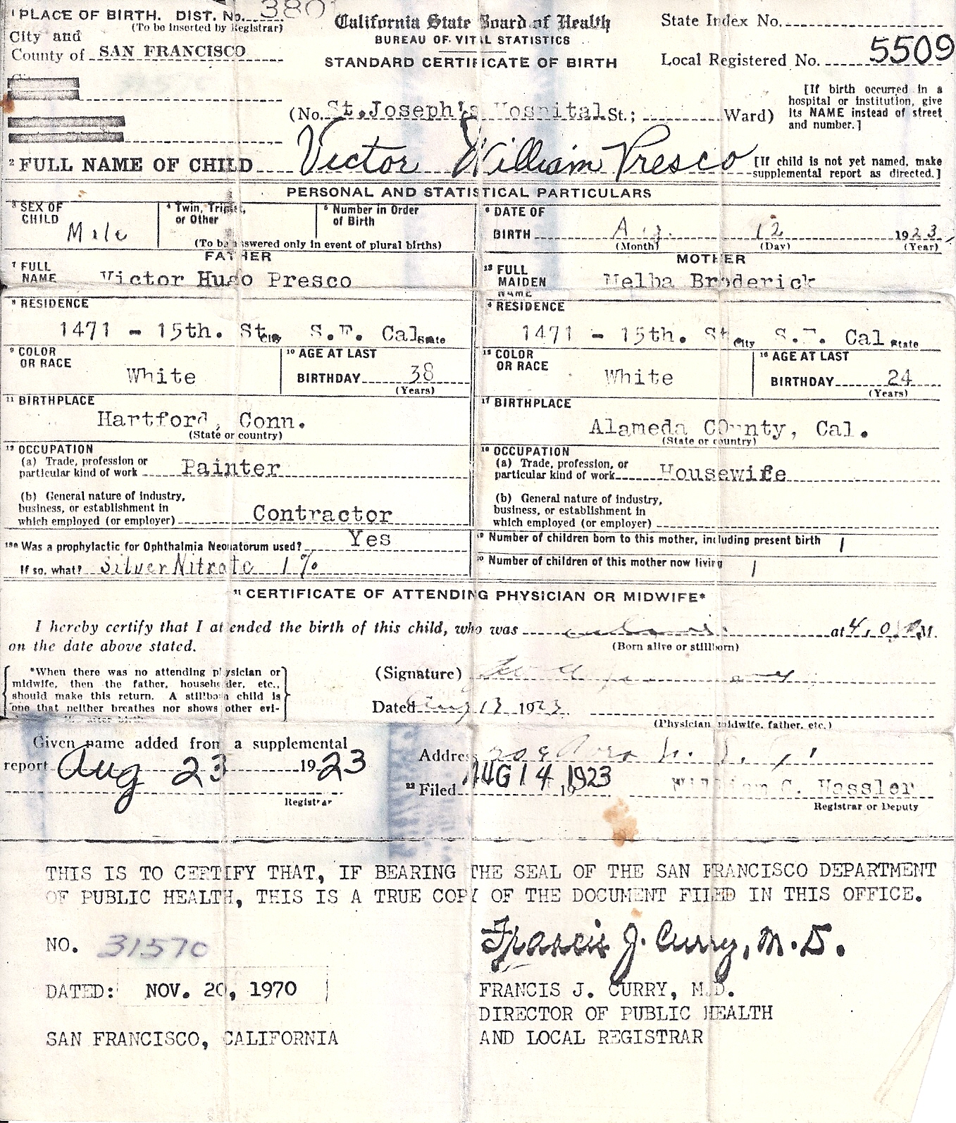Victor’s father, Wensel Anton Prescowitz, came from Bohemia Germany. My father’s lineage is true Bohemian that took root in the city by the bay that would become world famous for its Bohemian flavor. The name Victor Hugo suggests Wensel was an intellectual.