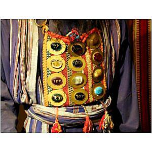 The Biblical description continues without describing the shape or length of the ephod, except by stating that it was held together by a girdle, and had two shoulder straps which were fastened to the front of the ephod by golden rings, to which the breastplate was attached by golden chains (Exodus 28:6-14) from this description it appears to have been something like a minimalist apron or skirt with braces,[1] though Rashi argued that it was like a woman’s riding girdle.[2] The biblical description also adds that there were two engraved gems over the shoulder straps (like epaulettes), made from shoham (thought by scholars to mean malachite,[2][4] by Jewish tradition to mean heliodor,[2] and in the King James Version is translated as “onyx”), and with the names of the 12 tribes written upon them; the classical rabbinical sources differ as to the order in which the tribes were named on the jewels (Sotah 36a).