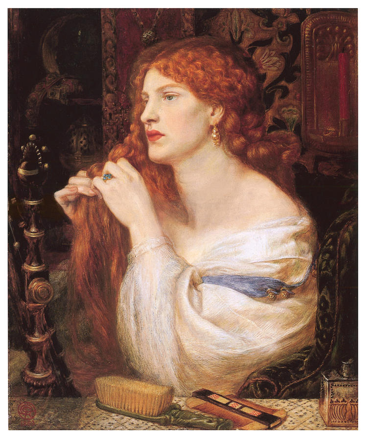 The spelling ‘Siddall’ was changed to Siddal when Dante Gabriel Rossetti dropped the second ‘l’, first noticed by Deverell in 1849, while she was working as a milliner in Cranbourne Alley, London. Whether Siddal had any artistic aspirations is unknown, though she loved poetry. She was employed as a model by Deverell and through him was introduced to the Pre-Raphaelites. William Michael Rossetti, her brother-in-law, described her as “a most beautiful creature with an air between dignity and sweetness with something that exceeded modest self-respect and partook of disdainful reserve; tall, finely-formed with a lofty neck and regular yet somewhat uncommon features, greenish-blue unsparkling eyes, large perfect eyelids, brilliant complexion and a lavish heavy wealth of coppery golden hair.”[1]