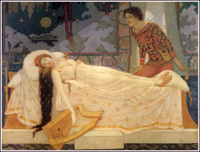 I met Belle Burch on the First Friday Art Walk April 4, 2014. Belle approached me when she saw I was filming her. I told her she looked like Botticelli’s Venus on a Half-shell. She felt flattered and blushed. I have compared the relationship of Botticelli and Simonetta Vespuccito, that of Sleeping Beauty. At the end of my video I tell Belle my blog has the legend of Sleeping Beauty at its core, and the family name, Rosamond, is key because that is the name Grimm gave the sleeping princess.