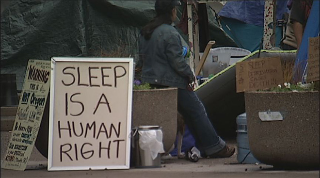 Downtown you’ll find SLEEPS, a rag-tag, yet seemingly well-organized assembly of ‘un-housed’ protestors and veteran street inhabitants with a message. “It’s everyone’s right as a human being to sleep.” And, SLEEPS believes that the un-housed should be allowed to do so safely within the city limits of Eugene; without harassment from the citizens or law enforcement and without the daily breaking and moving of camp.