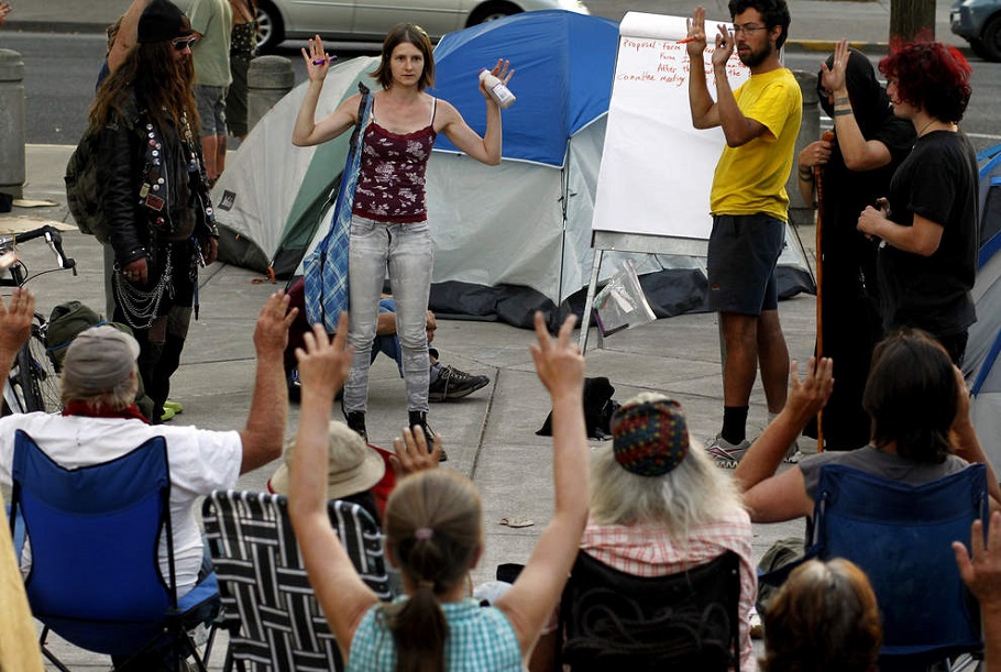 Photo 2:Homeless activist Alley Valkyrie (center) raises her hands along with other activists to signal assent as campers at the Wayne Morse Free Speech Plaza in Eugene vote Tuesday night on the rules that will govern the protest action outside the Lane County Courthouse. (Paul Carter/The Register-Guard)