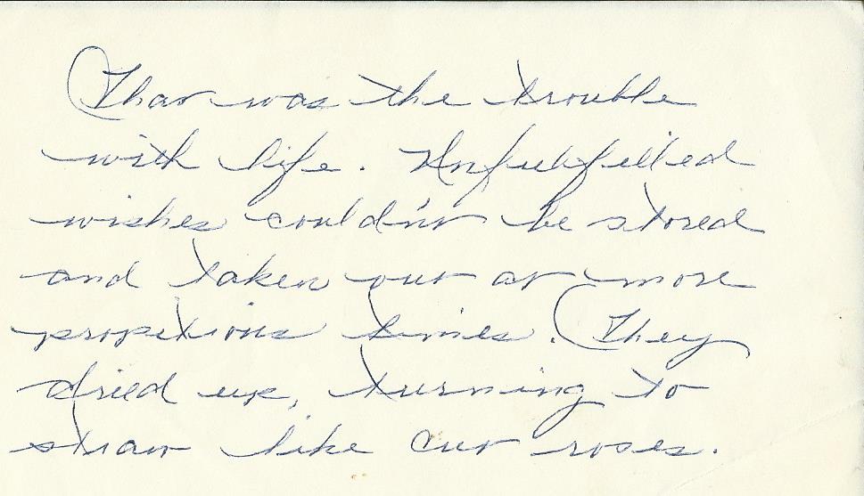 “That was the trouble with life. Unfulfilled wishes couldn’t be stored and taken out at more prosperous times. They dried up. Turning to straw like cut roses.”