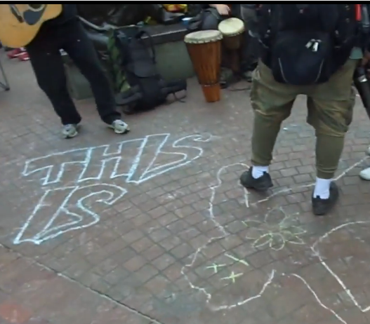 On a beautiful Friday afternoon in early 2012, approximately fifty people spontaneously appeared in Kesey Square, bringing tables, chairs, board games, free food, music, street theater, and chalk art. We spent the afternoon interacting with the community, creating a space that was welcoming to everyone, whether housed, unhoused, or somewhere in between. The response to our presence was overwhelmingly positive, and as a result, we gathered at Kesey almost every Friday during the warm months of 2012.