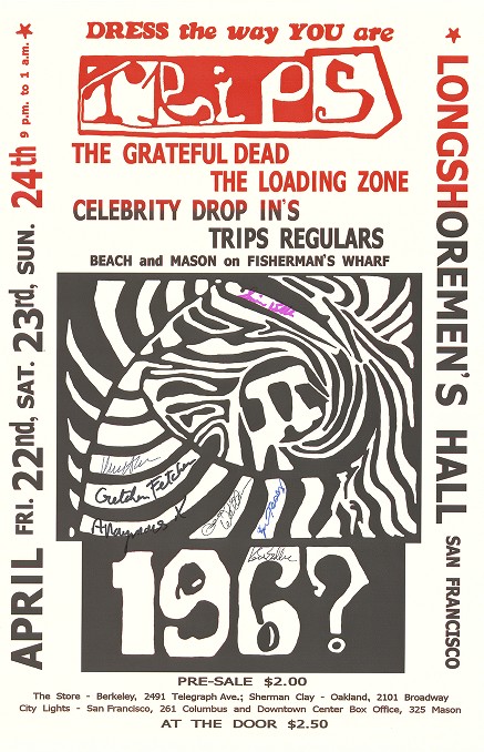 An extremely rare San Francisco collectible from the Psychedelic era–an original program from the legendary January, 1966 Trips Fesvial at the Longshoreman’s Hall in San Francisco. This 3 night event was the first true psychedelic event in the bay area, and has been written about extensively.