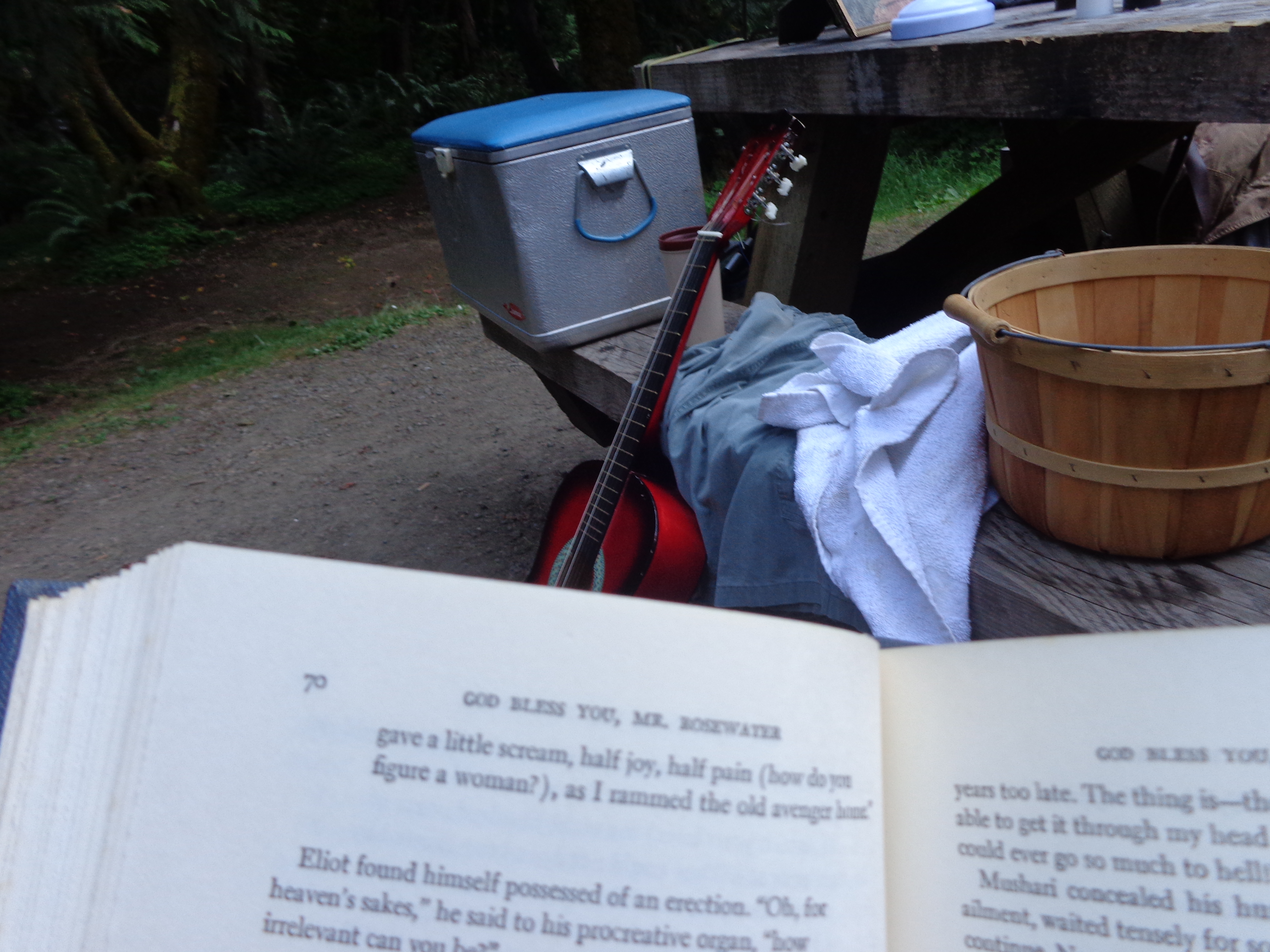 I took Mr. Rosewater camping with me. I checked out Vonnegut’s intriguing novel that depicts an eccentric who inherits a large family fortune and makes philanthropy his vocation, his excuse for living; for in truth he is a drunken slob wanna-be fire chief, he on par with the scum-filled nobodies and parasites he is dedicated to in hope he can turn their life around.