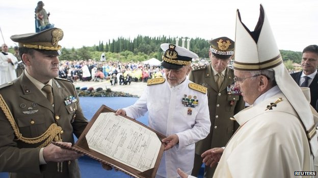 The Pope was speaking during a mass at the Italian first World War memorial at Fogliano di Redipuglia, near to Gorizia on the Italian border with Slovenia. More than 100,000 fallen Italian soldiers are believed to be buried in the Fascist-era military graveyard, close to the scene of some of the most decisive battles at the end of the Great War.