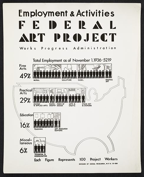 The Federal Art Project (FAP) was the visual arts arm of the Great Depression-era New Deal Works Progress Administration Federal One program in the United States. It operated from August 29, 1935, until June 30, 1943. Reputed to have created more than 200,000 separate works, FAP artists created posters, murals and paintings. Some works still stand among the most-significant pieces of public art in the country.[2]