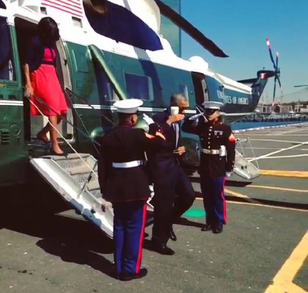 In a video posted on the White House’s Instagram, Obama is seen exiting the presidential helicopter and saluting the standing guards as is tradition.