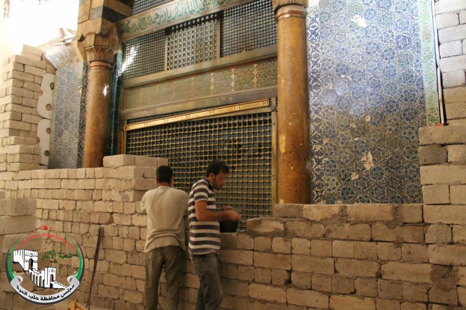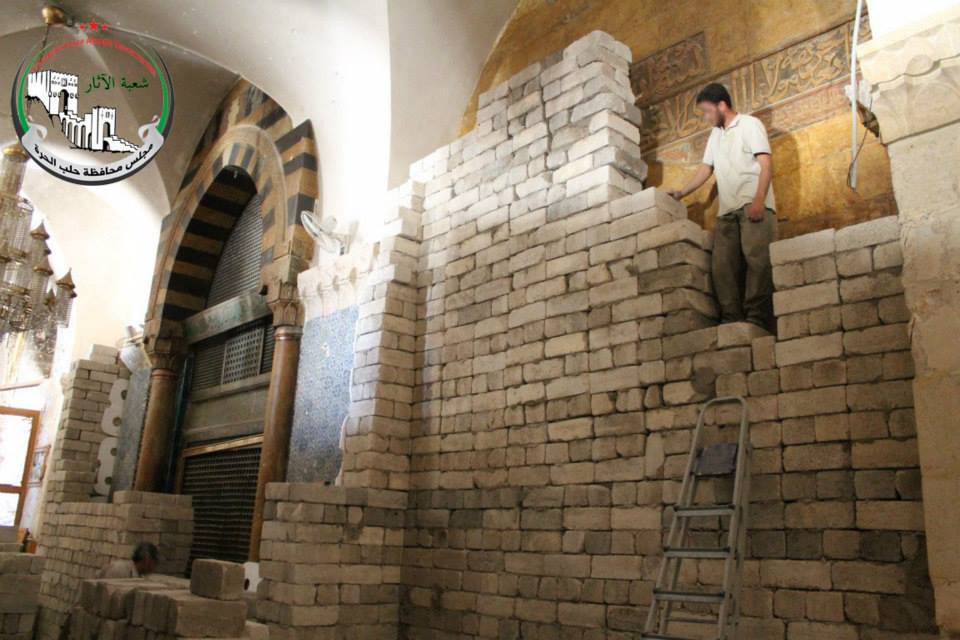 Aleppo, once Syria’s largest and richest city, is where such actions have been most prevalent. The Division of Antiquities of the Free Council of Aleppo was founded in 2013 and has sandbagged and walled up the precious sundial in the Aleppo Great Umayyad Mosque, and bricked up its shrine of the Prophet Zachariah. With the help of the Tawhid Brigade from the Free Syrian Army, they have dismantled its 12th century wooden mihrab for safe-keeping away from the front line.