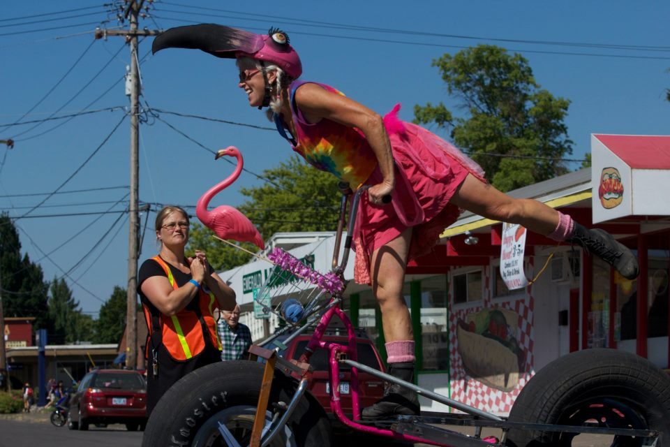 In 2014, the event’s management company, Kesey Enterprises, initially released a statement in June cancelling the August Celebration, citing new construction and growth in Eugene’s revitalized downtown that reduced the space needed for entertainment and food venues.[2] Kesey Enterprises later agreed to partner with the City of Eugene to host a $5 concert at the Cuthbert Amphitheater during the weekend. A free alternative “Festival of Eugene” at Skinner Butte Park was organized by Krysta Albert, who persisted despite a saga of funding and location uncertainties lasting as late as two weeks before the event.[3] The Festival included “health and wellness vendors, nonprofit groups, food booths, live music and poetry readings.”[4] The Eugene Celebration Parade featured Lane Community College as the grand marshal, and included 70 groups of “school bands and dance troupes, the 2014 Slug Queen and his entourage, the fencers, roller derby skaters and belly dancers, and the primarily liberal politicians and political causes.”[5]