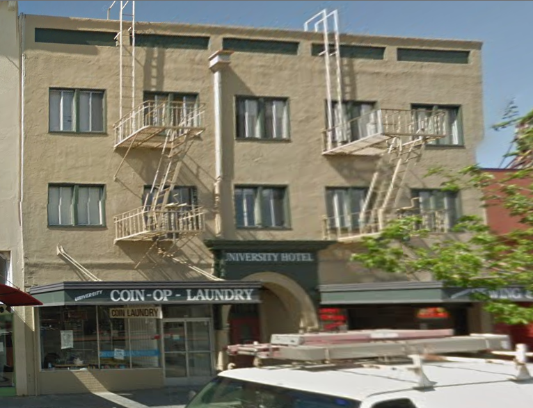 Here is a photograph of the University Hotel where I lived for almost a year. It is located in Berkeley California near Shattuck. The UC campus is three blocks up the street. Below the hotel is the University Coin-OP Laundry. It is here I almost got shot by a crazy Mexican crack dealer. It is a miracle I am still alive.