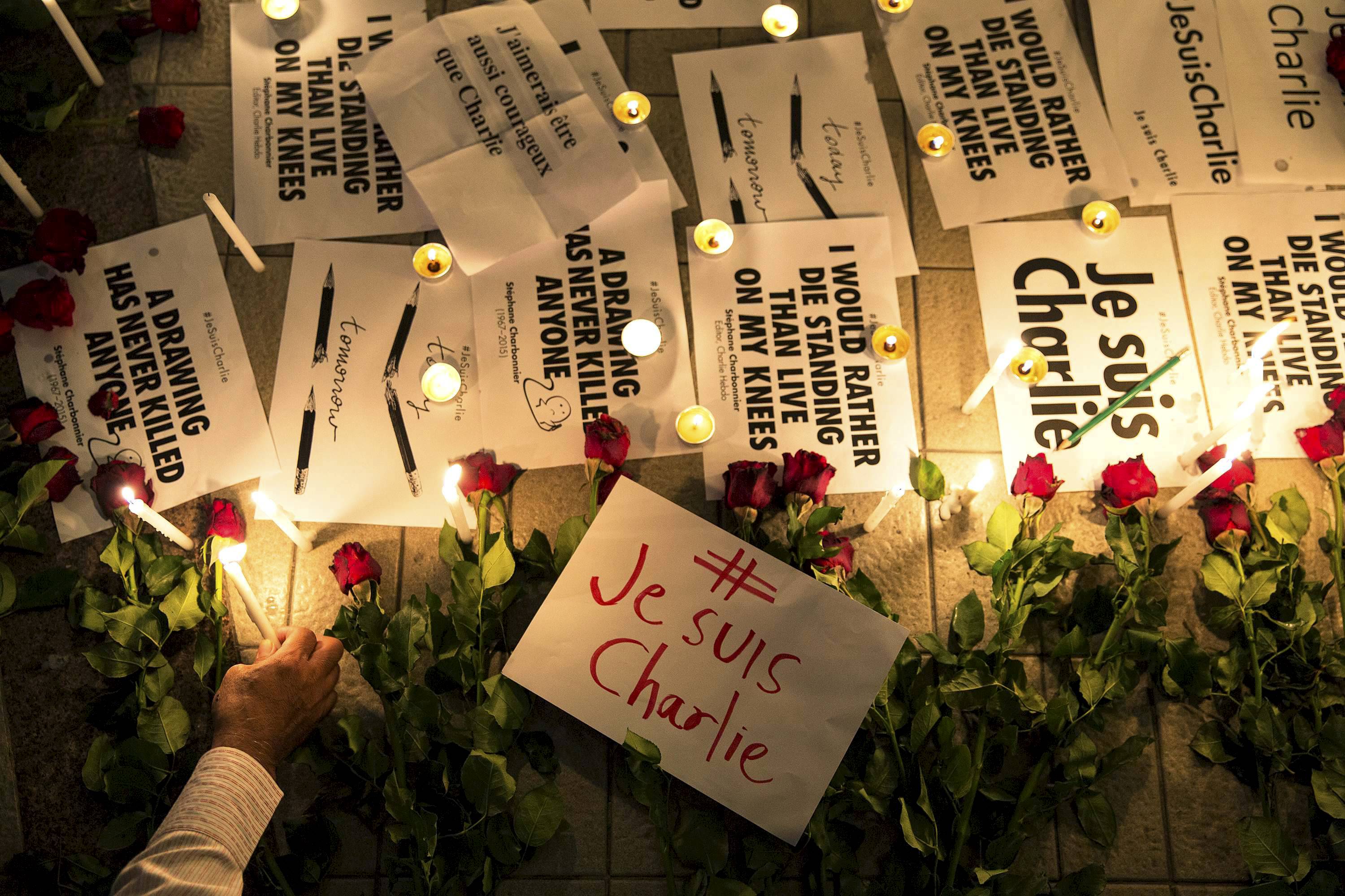 Many held placards proclaiming “Je Suis Charlie” — “I am Charlie” — a slogan that went viral on social media within hours of Wednesday’s terror attack on the French satirical weekly Charlie Hebdo that left 12 people dead.