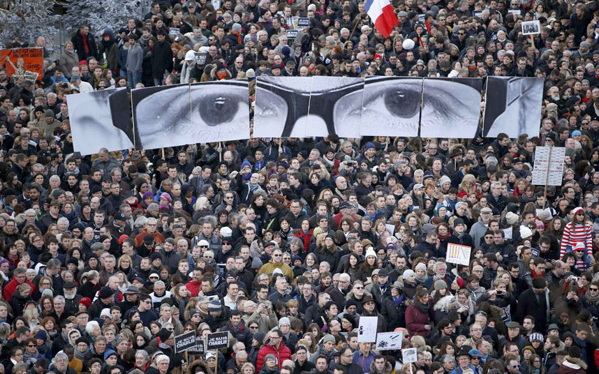 “Je Suis Charlie” — “I Am Charlie,” read legions of posters and banners. Many waved editorial cartoons, the French tricolor and other national flags.