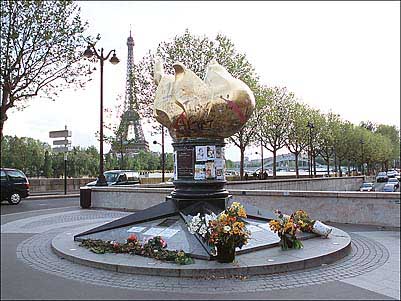 “The Flame of Liberty. An exact replica of the Statue of Liberty’s flame offered to the people of France by donors throughout the world as a symbol of the Franco-American friendship. On the occasion of the centennial of the International Herald Tribune. Paris 1887-1987.”