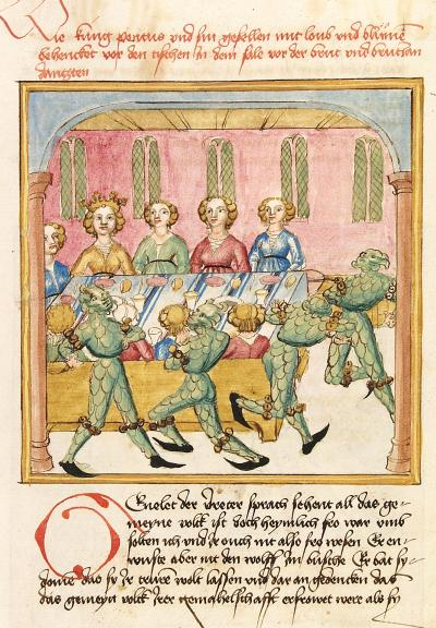 Pontus and his train disguised as wild men at the wedding of Sidonia and Genelet, illustration in a manuscript commissioned for Margarethe of Savoy in ca. 1475