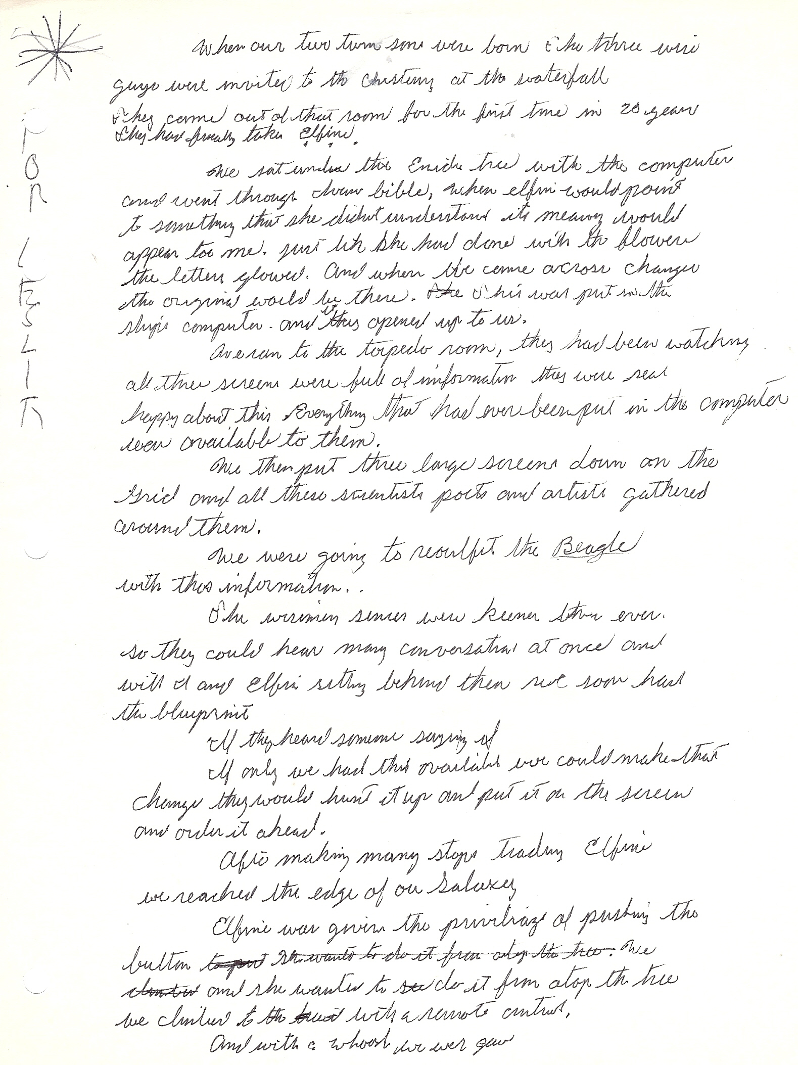 “We sat under the Enidu Tree with the computer and went thru Ivan’a Bible. When Elfin would point to something she did not understand, its meaning would appear to me, just like she had done when she touched the flowers, the letters glowed. And when she cam across the changes, the original would be there. This was put within the ships computer, and it opened up to us.”