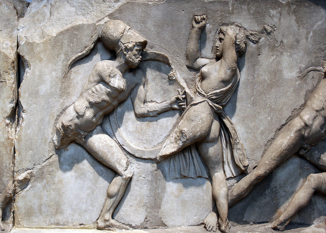One of the tasks imposed upon Heracles by Eurystheus was to obtain possession of the girdle of the Amazonian queen Hippolyta.[25][26][27][28] He was accompanied by his friend Theseus, who carried off the princess Antiope, sister of Hippolyta, an incident which led to a retaliatory invasion of Attica,[29][30] in which Antiope perished fighting by the side of Theseus. In some versions, however, Theseus marries Hippolyta and in others, he marries Antiope and she does not die; by this marriage with the Amazon Theseus had a son Hippolytus. The battle between the Athenians and Amazons is often commemorated in an entire genre of art, amazonomachy, in marble bas-reliefs such as from the Parthenon or the sculptures of the Mausoleum of Halicarnassus.